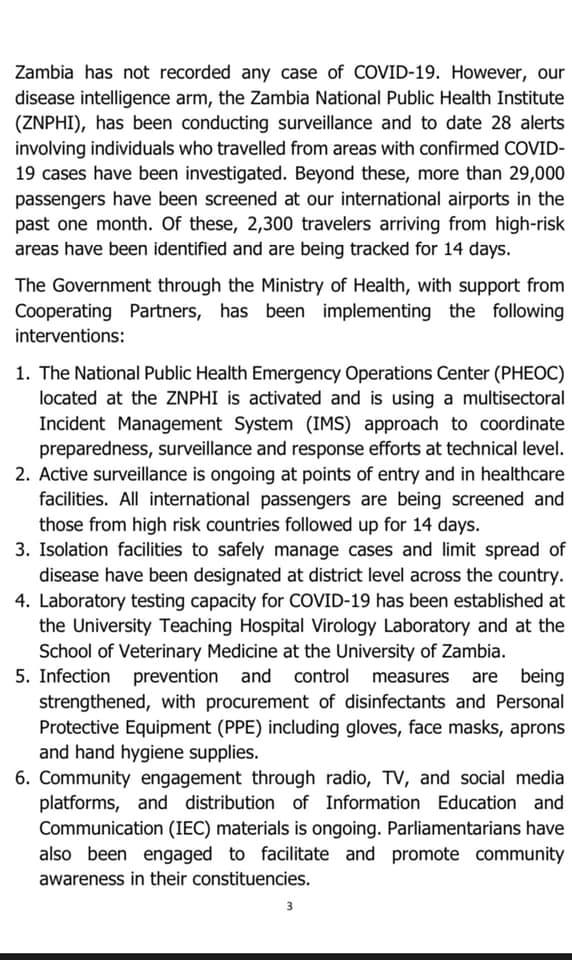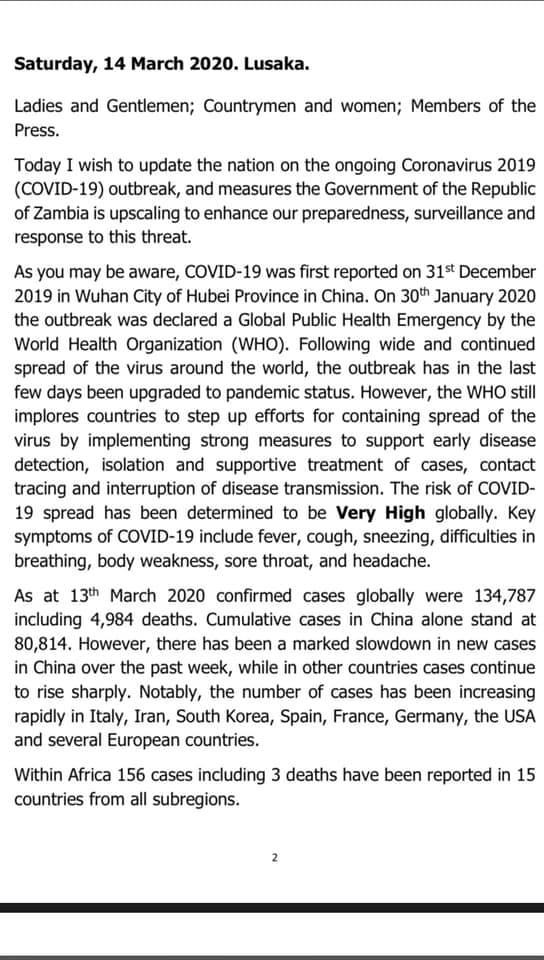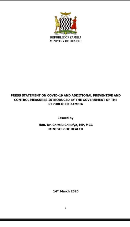 Zambiya Sağlık Bakanı Dr. Chitalu Chilufya 14 Mart günü Hükümet Sözcüsü, Enformasyon ve Yayıncılık Bakanı Dora Siliya ile birlikte basın toplantısı düzenleyerek, COVID-19 ile ilgili kapsamlı açıklamalarda bulunmuştur.