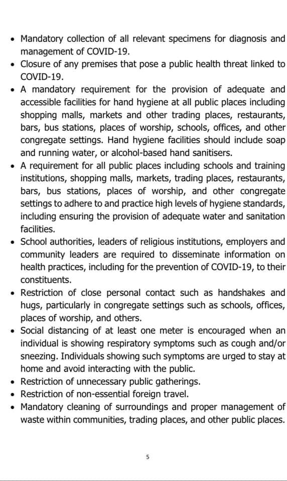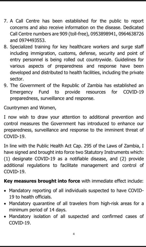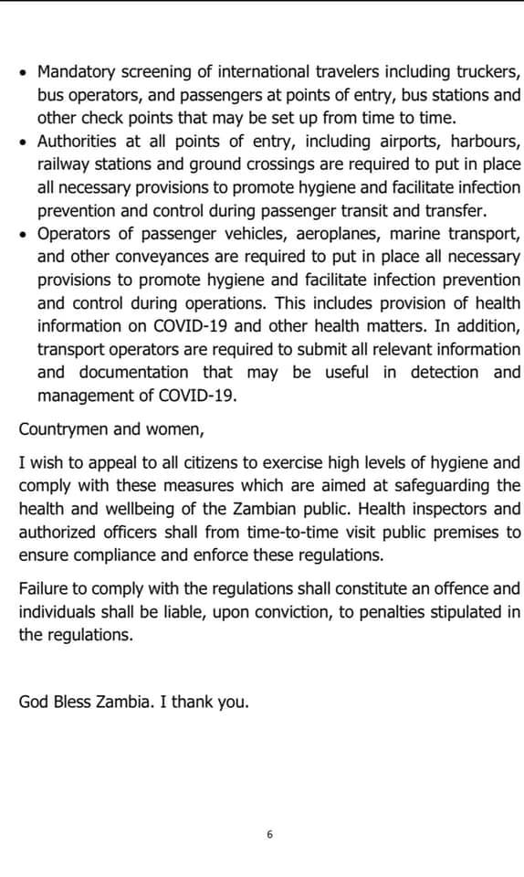 Sağlık Bakanı Chilufya ayrıca Kamu Sağlığı Kanunu uyarınca COVID-19'un bildirilmesi zorunlu bir hastalık olarak tanımlandığını ve hastalığın kontrolü ve yönetimini kolaylaştırmak üzere ek düzenlemeler yapan iki yönetmeliği (statutory instrument) imzaladığını ve bunların yürürlüğe girdiğini belirtmiştir. Yürürlüğe giren yönetmeliklerde ele alınan temel unsurlar aşağıda sunulmaktadır: