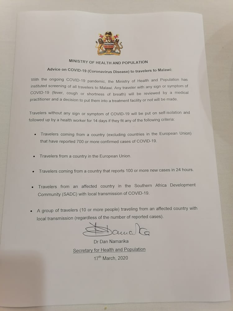 Malavi Sağlık ve Nüfus Bakanlığından temin edilen 17 Mart tarihli açıklamanın metni ekte sunulmaktadır.